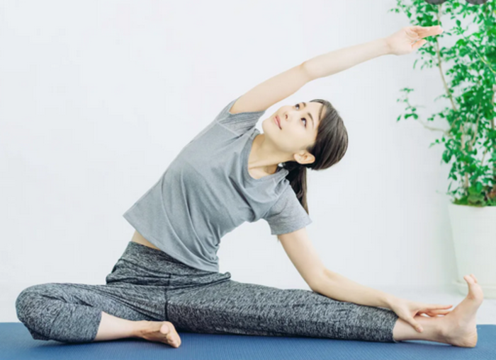 옆구리 늘리기를 할때 다리를 최대한 벌린 후 바닥에 앉아줍니다.