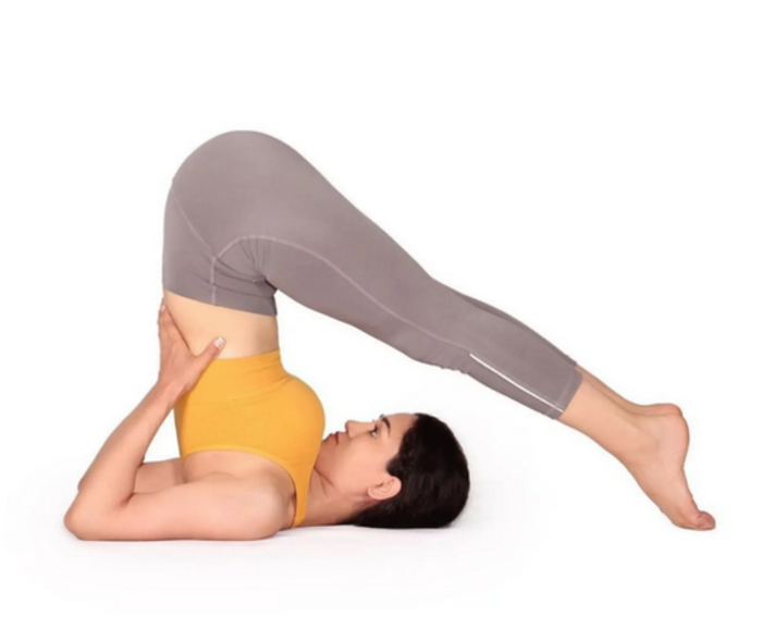 발끝이 머리 위 바닥에 닿게 하고 양손은 머리 뒤를 받칩니다.