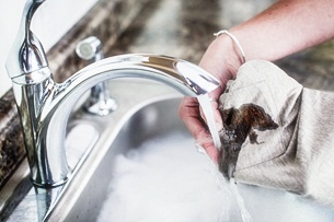 이후 차가운 물에 30분간 담가두고 얼룩이 사라졌는지 살펴보십시오. 얼룩이 남아 있다면 따뜻한 물에 5~15분간 담가 두었다가 이후 완전히 헹구어냅니다.