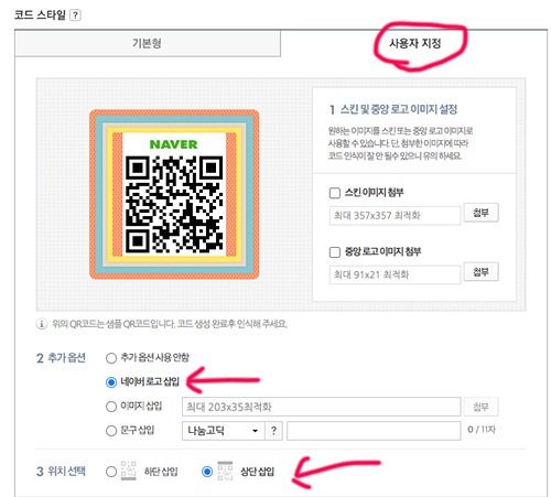 왼쪽을 클릭하면 만들기 폼이 등장합니다. 코드 제목, 코드 스타일 두 가지로 구성되어 있는데요. 먼저 코드 제목을 필수적으로 입력하십시오. 이후 코드 스타일에서 기본형 또는 사용자 지정을 통하여 컬러나 패턴을 추가하실 수 있습니다. 또한 추가 옵션 메뉴를 통해 네이버 로고를 삽입하거나 자신이 직접 제작한 로고를 넣을 수 있습니다. 3번 위치 선택에서는 로고의 위치를 하단 상단으로 조절하실 수 있습니다.